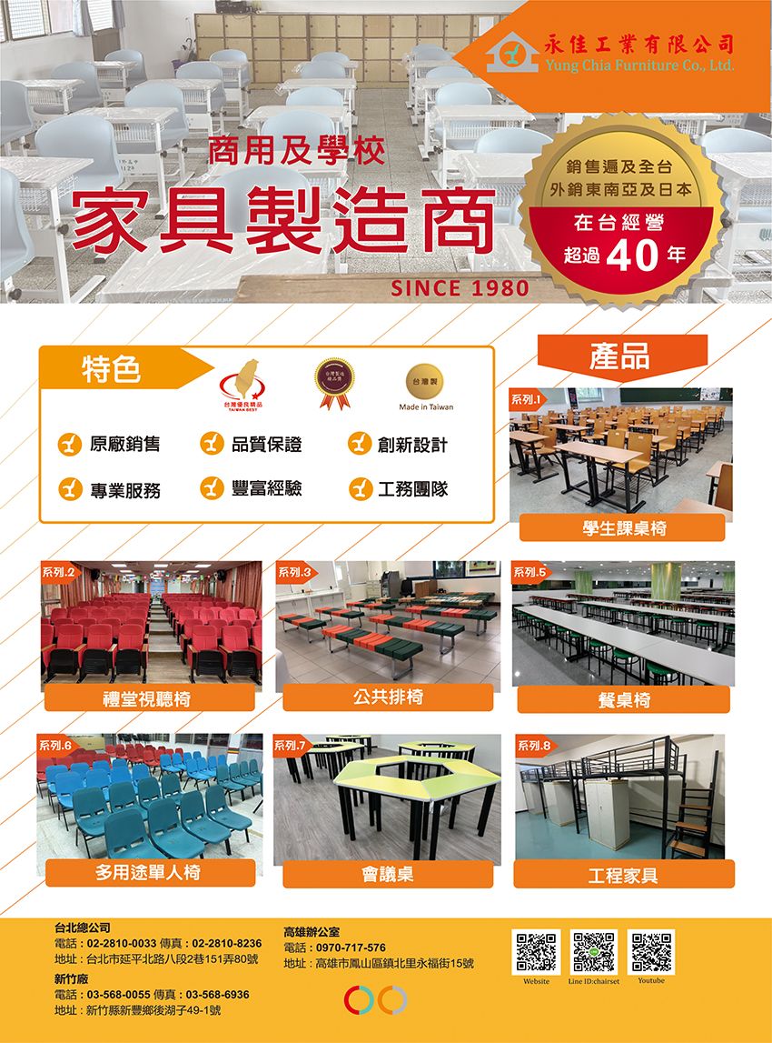 課桌椅、禮堂視聽椅、看臺椅、公共排椅、餐桌椅、閱讀椅、會議桌、梯形桌、折合會議桌、游泳教學椅、收納車、升降課桌椅、梯型課桌椅、六角課桌椅、學生課桌椅、視聽椅、階梯教室座椅、等候椅、長板凳、實木排椅、玻璃纖維排椅、咖啡廳桌椅、戶外餐桌椅、野餐桌椅、員工餐廳座椅、工作椅、會客椅、曲木椅、辦公椅、升降椅、教師椅、裁判椅、折合椅、餐椅、圓板凳、掀合會議桌、活動會議桌、組合會議桌、圓形會議桌、環型會議桌、升降桌、塑膠會議桌、洽談桌、圓盤腳、不銹鋼桌腳、水中教學椅、宿舍床、講台、置物櫃、書包櫃、工作站