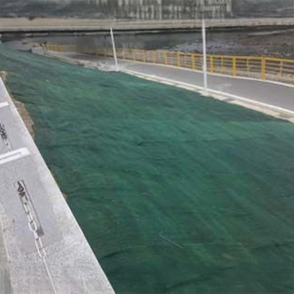 抗沖蝕毯主要材質為聚丙烯(P.P.),上下兩層為聚烯格網,格網內部均勻舖置綠色聚丙烯纖維所形成,為複層式高孔隙率結構,底層為平面形式,得以與邊坡坡面貼地密合,充分抵抗邊坡受降雨產生之表面逕流沖刷,加強穩定邊坡,坡地經整坡、舖設、錨定、機械噴附植生基材(一般採用百慕達草、百喜草、黑麥草等混合草種) 、灑水養生、循序施工完成綠化植生。