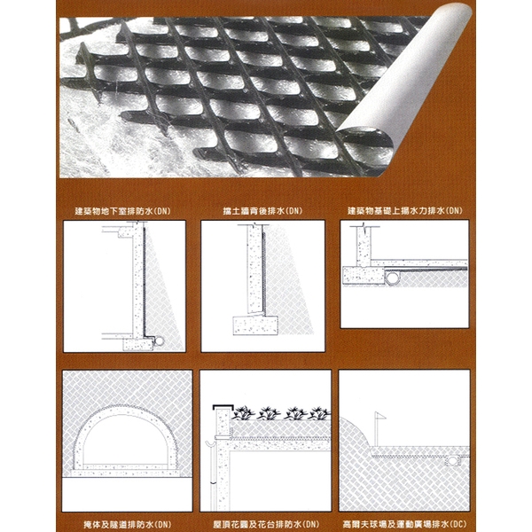 菱型排水片係由三層結構複合形成,中間氣隙層為厚度8mm以上H.D.P.E.(高密度聚乙烯)菱型網,上層及下層結合透水濾布,將土壤中過剩之滲透水,經由透水濾布流入縱橫交錯之菱型網氣隙層中,再藉由氣隙層之立體排水空間導水至透水管排除。適用於各種型式擋土墻背面垂直及水平排水、公路及鐵路之軟弱地基排水、隧道排水、運動場盲溝排水、屋頂花園底部排水、水上保持工程及整地工程的盲溝排水系統等。