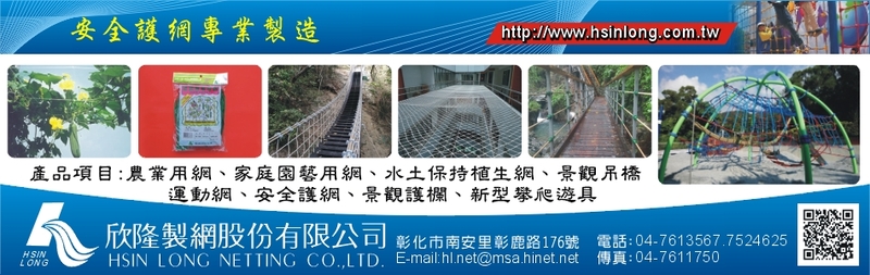 ※服務項目:安全網、運動網、農業用網、安全護網、新型攀爬遊具、V型叢林吊橋、格子爬網、攀岩組、景觀護欄安全繩索、水土保持植生網、懸掛網、家庭園藝用網、景觀護欄、鞦韆、球類練習網、球類圍網、植生網、環保橡膠磚、安全繩索、地墊、植生網、體健器材