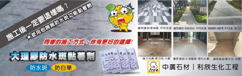 本公司至成立以來,一直秉持著"誠信"的經營理念,誠信履行每一張合約及訂單,堅持給客戶最好的服務!追求高品質及高效率,以滿足客戶需求為優先的理念,一直是本公司的最高目標!營業項目:防水黏著劑、石材防護劑、防污劑、大理膠、黏著劑、大理膠防水斑黏著劑、拋光磚防護劑、拋光磚奈米晶化劑、除鏽劑、水斑清潔劑、石材增艷防護劑、瓷盾牌拋光石英磚防污劑、花崗石、大理石、人造石等各類石種設計承包、石材正面防護劑、石材背面防護劑、大理膠石材防水斑黏著劑、奈米矽膜保護劑、水性氟素石材防護劑、除銹劑、奈米拋光液A液、石材拋光液、花崗石水斑處理、大理石水斑處理、人造石水斑處理、石材除鏽劑、石材除銹劑、石材增艷...等。