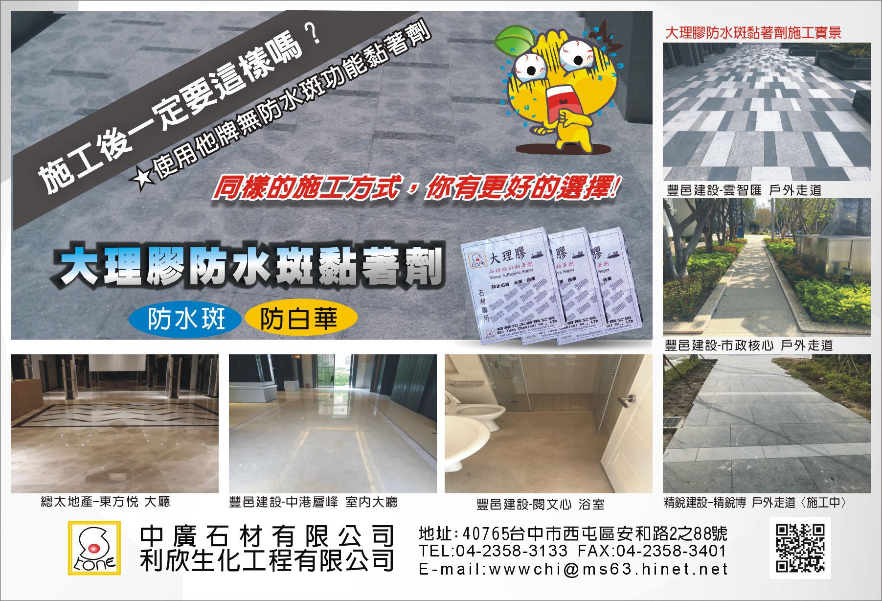 ◎服務項目:防水黏著劑、石材防護劑、防污劑、大理膠、黏著劑、大理膠防水斑黏著劑、拋光磚防護劑、拋光磚奈米晶化劑、除鏽劑、水斑清潔劑、石材增艷防護劑、瓷盾牌拋光石英磚防污劑、花崗石、大理石、人造石等各類石種設計承包、石材正面防護劑、石材背面防護劑、大理膠石材防水斑黏著劑、奈米矽膜保護劑、水性氟素石材防護劑、除銹劑、奈米拋光液A液、石材拋光液、花崗石水斑處理、大理石水斑處理、人造石水斑處理、石材除鏽劑、石材除銹劑、石材增艷、台中石材防護劑、台中石材防水黏著劑