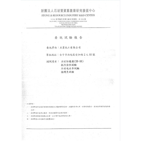 對於不熟悉的石材,使用本產品加深石材顏色的程度,請客戶先做小樣產品,確認後再使用。⒉本產品在大量使用前,請先做小實驗。