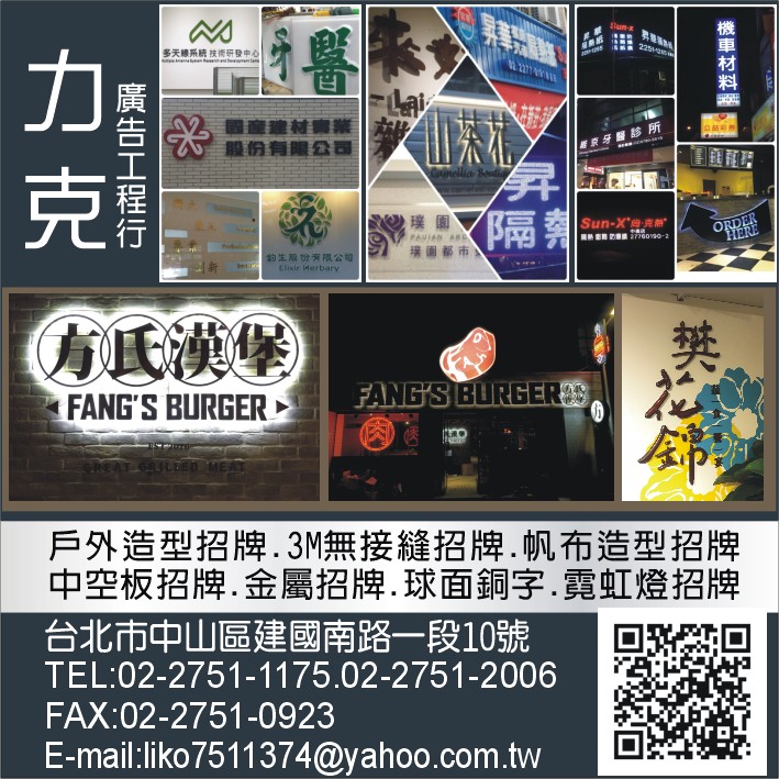 廣告招牌、戶外造型招牌、3M無接縫招牌、金屬招牌、防颱招牌、帆布造型招牌、球面銅字、中空板招牌、霓虹燈招牌、水晶立體字、壓克力招牌、電腦輸出噴圖、鍍鈦金字、不銹鋼字、腐蝕銅牌、金木字、台北戶外造型招牌、台北水晶立體字、台北金屬招牌、台北招牌、台北防颱招牌戶外造型招牌、台北戶外造型招牌、台北帆布造型招牌...等。