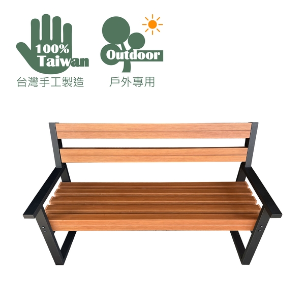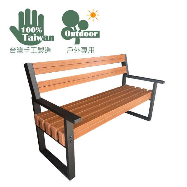 專為戶外專用設計的公園椅,其椅面為塑木材質,具實木高質感及優良的耐侯性,於戶外長期使用不怕腐爛及白蟻侵蝕,搭配金屬錏管烤漆,異材質結合表現出剛柔並濟的效果。