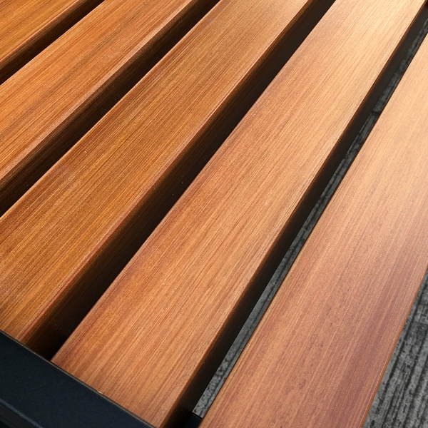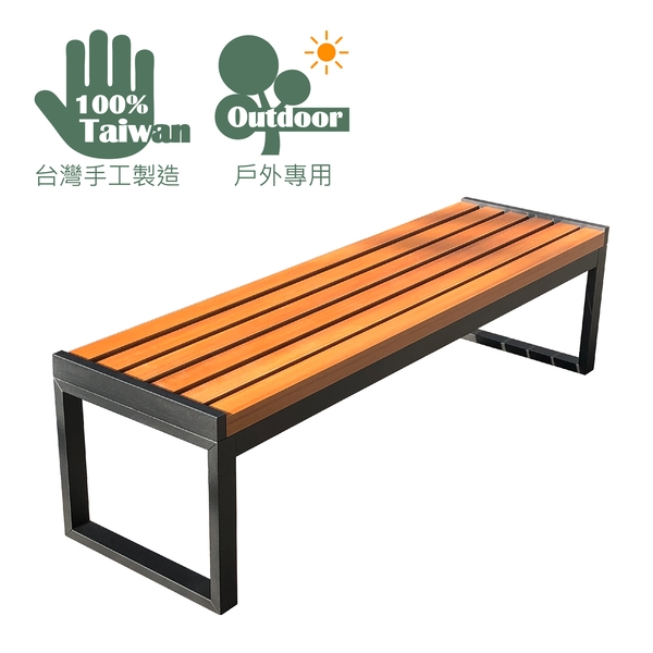 專為戶外專用設計的公園椅,其椅面為塑木材質,具實木高質感及優良的耐侯性,於戶外長期使用不怕腐爛及白蟻侵蝕,搭配金屬錏管烤黑漆或不鏽鋼管,異材質結合表現出剛柔並濟的效果。