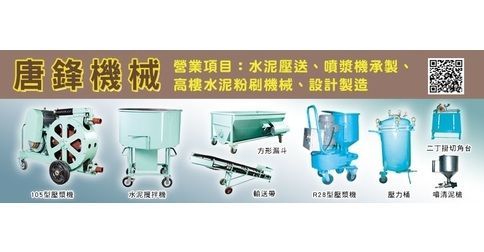 105型水泥灌漿機、75型水泥噴漿機、水泥攪拌機、漏斗(二次攪拌)、方形漏斗、R28輕型水泥灌漿機、R28型壓漿機、壓力桶、輸送帶、壓漿機、二丁掛切台、噴清泥槍、水泥壓送機、高樓水泥粉刷機械