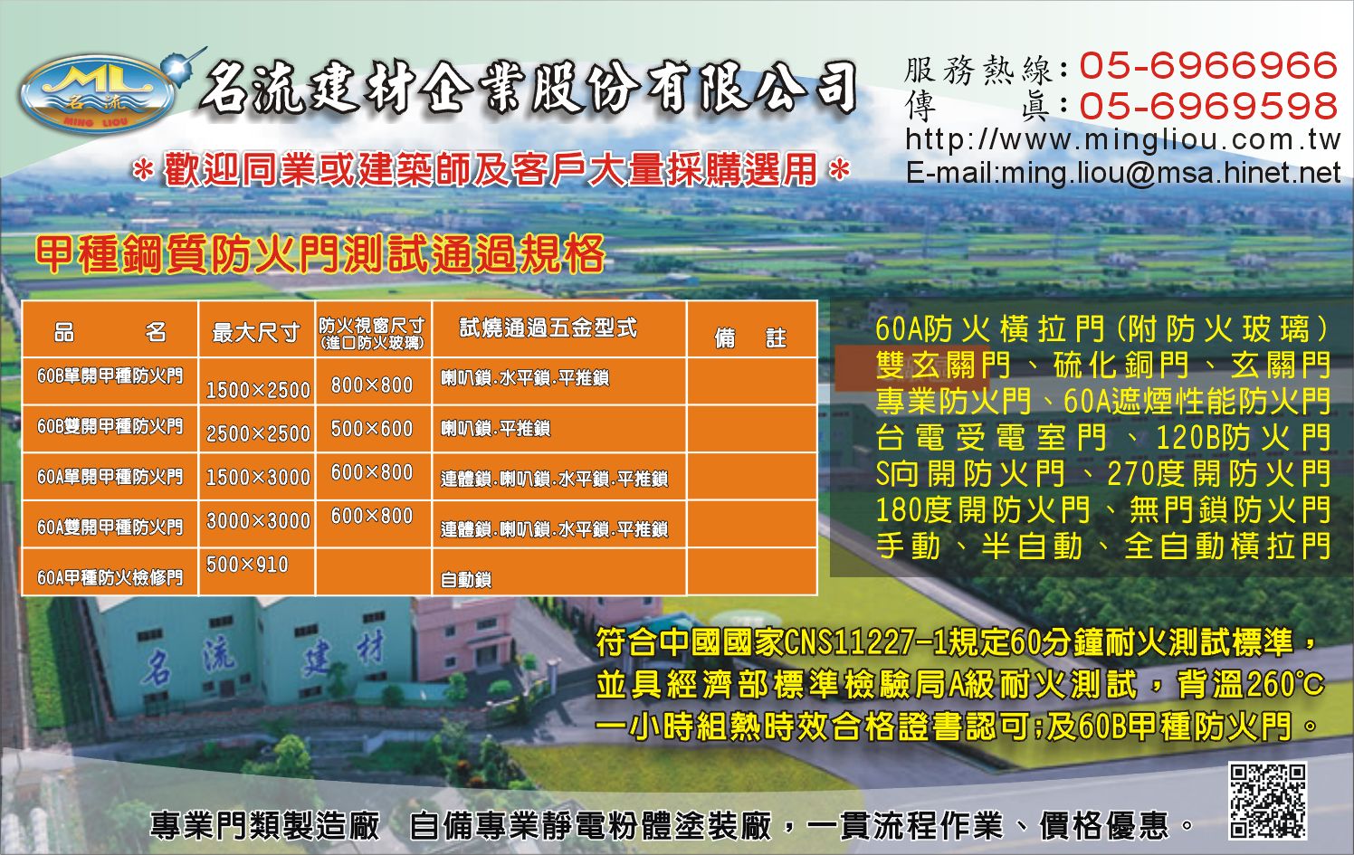 名流建材企業股份有限公司籌備成立於1995年總廠面積達7563坪,致力於防火門的設計開發與製造並通過多項國家標準認證。