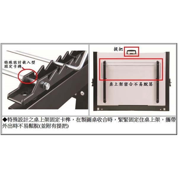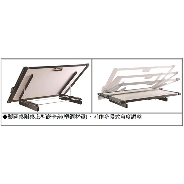2.製圖桌附桌上型嵌卡架(塑鋼材質),可作多段式角度調整。