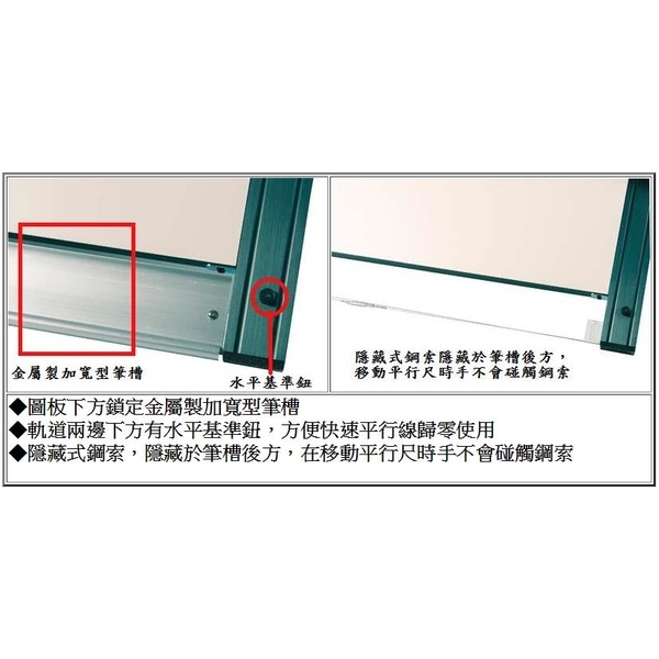13.隱藏式鋼索,隱藏於筆槽後方,在移動平行尺時手不會碰觸鋼索。