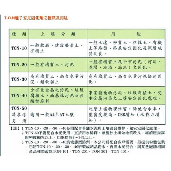 土壤固化劑、土壤安定固化劑、T.O.N離子安定固化劑、固化劑、離子安定劑、土壤固化、重金屬捕捉劑、重金屬固化螯合劑、飛灰處理穩定劑、一般型螯合劑、強效型螯合劑、安定固化劑、福美鈉、營建工程、道路施工工程、建築用化學品、混凝土添加劑、建築用養護劑、土固精、土壤觸媒劑、土壤改良穩定液、土壤酵素穩定劑、鋪面耐磨劑、T.O.N水泥系列、NSC-SA土壤固化劑(含粉狀膠結劑及液狀固化固結劑)、 道路路盤路床安定固化處理、河川汙泥固化、水庫汙泥固化、湖泊汙泥固化、深層地盤改良安定固化、淺層地盤改良安定固化、有害重金屬汙泥安定固化、垃圾掩埋場腐植土安定固化、掩埋場之不透水層安定固化、深淺層地質改良、軟弱土壤安定固化。