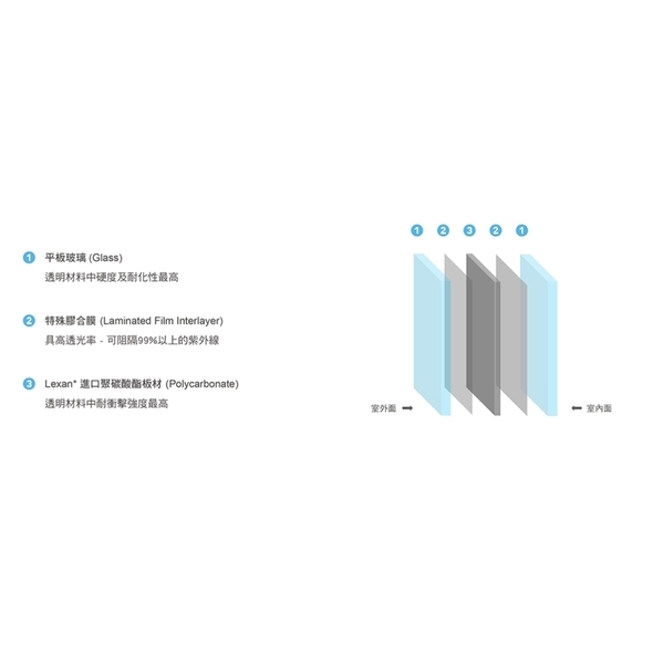 將兩片(或兩片以上)的玻璃,透過特殊膠膜將透明材料中耐衝擊強度最高的聚碳酸酯板材(Polycarbonate)膠合而成。