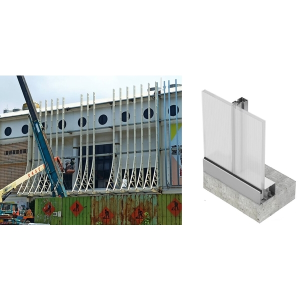 帷幕牆面、外牆包覆、屋面系統、風雨走廊、遮陽系統、室內隔間系統