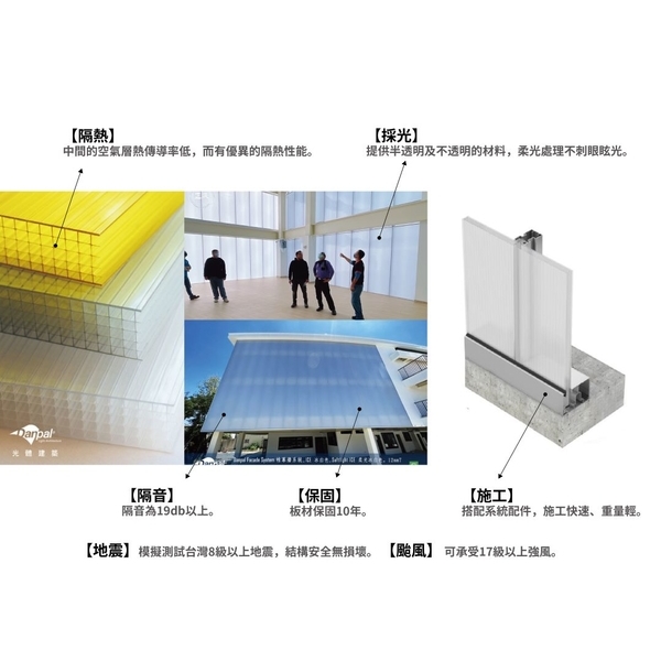 板材具有獨特的半透明性、輕量化的模組系統、安裝簡易快速,縮短工期及成本,且擁有優異的節能隔熱的特性,可以大幅節省能源,我們的系統也符合LEED美國綠建築協會認證的評分標準,提供柔和舒適的生活環境。