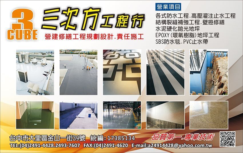 各式防水工程、結構裂縫補強工程、高壓灌注止水工程、水泥硬化拋光地坪、EPOXY地坪工程、環氧樹脂地坪工程、壁癌修繕、SBS防水毯、PVC止水帶、太空陶瓷隔熱工程、中庭PU防水、外牆填縫防水、EPOXY藝術地坪、藝術地坪、壓克力球場、防水、抓漏、隔熱、止漏、壁癌、高壓灌注、屋頂隔熱、屋頂防水、外牆防水、三次方、台中防水工程、台中壁癌修繕、台中防水抓漏、台中止漏工程、台中地坪工程、台中環氧樹脂地坪工程、台中防水毯、台中PU防水、台中高壓灌注、台中隔熱工程、台中藝術地坪、台中屋頂防水、台中水泥硬化地坪