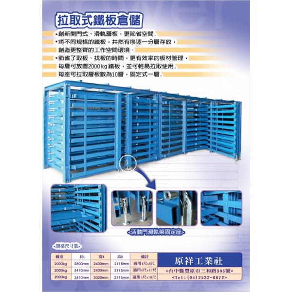 ※最新開發【雙向取料之拉取式鐵板倉儲】、可放置於工廠兩列之間、天車可吊到之處、使用非常方便而又不佔空間。