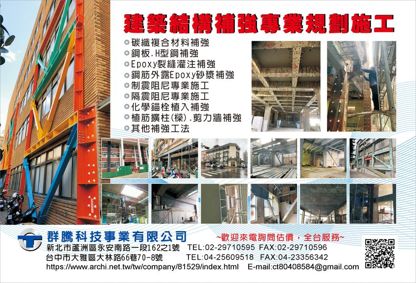 群騰科技事業有限公司為RC建築結構補強專業規劃施工廠商,歡迎來電詢問估價,全省服務ct80408584@gmail.com