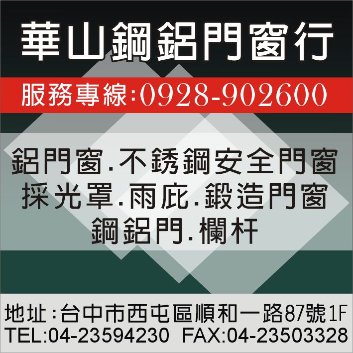 鋁門、鋁窗、不銹鋼安全門窗、採光罩、雨庇、鍛造門窗、鋼鋁門、欄杆、門、窗、華山、不銹鋼安全門窗批發、台中不鏽鋼安全門窗批發、台中採光罩、台中欄杆、台中鋁門、台中鋁門窗、台中鋼鋁門、台中雨庇、台中欄杆、台中門窗工程