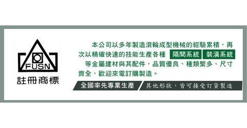 富聖機械有限公司以多年製造滾輪成型棧械的經驗累積,投入生產各種"隔間系統"、"裝潢系統"等金屬建材與其配件,品質優良、種類繁多、尺寸齊全,歡迎來電訂購製造。 高品質的產品榮獲ISO-9001認定品質合格。準確的品質、種類的齊全、尺寸的完整,近年更倍受業界肯定及採用。