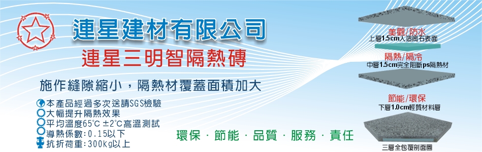 本公司唯一研發、製造、銷售國內「 三明智 隔熱磚 」的專業廠商,首創「40cmx40cm」的大尺寸規格隔熱磚,『施作縫隙縮小,隔熱材覆蓋面積加大』,相較於傳統隔熱磚更大幅提升隔熱效果;嚴選素材、為品質把關,目標是在多贏的前題下提供顧客『最高效益、最高品質、最合理價格』的優質服務。