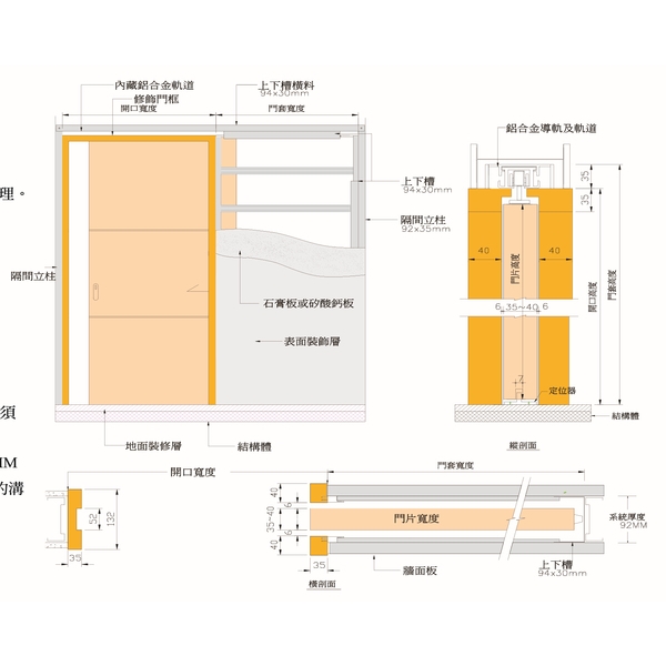 門套系統厚92mm,完成牆厚120-130mm,與常用的隔間牆相同,不須另設骨架,不會增加牆面厚度。