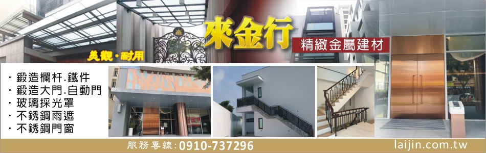 來金行創業至今已30年,向來傳承金屬的工藝精華將鐵件藝術融入居家生活品味中,有著豐富的經驗,能將金屬塑造成各種造型,製造出讓客戶稱心滿意以及美觀耐用的精緻金屬建材,讓建築設計師的心血結晶,讓您的住宅畫龍點睛。