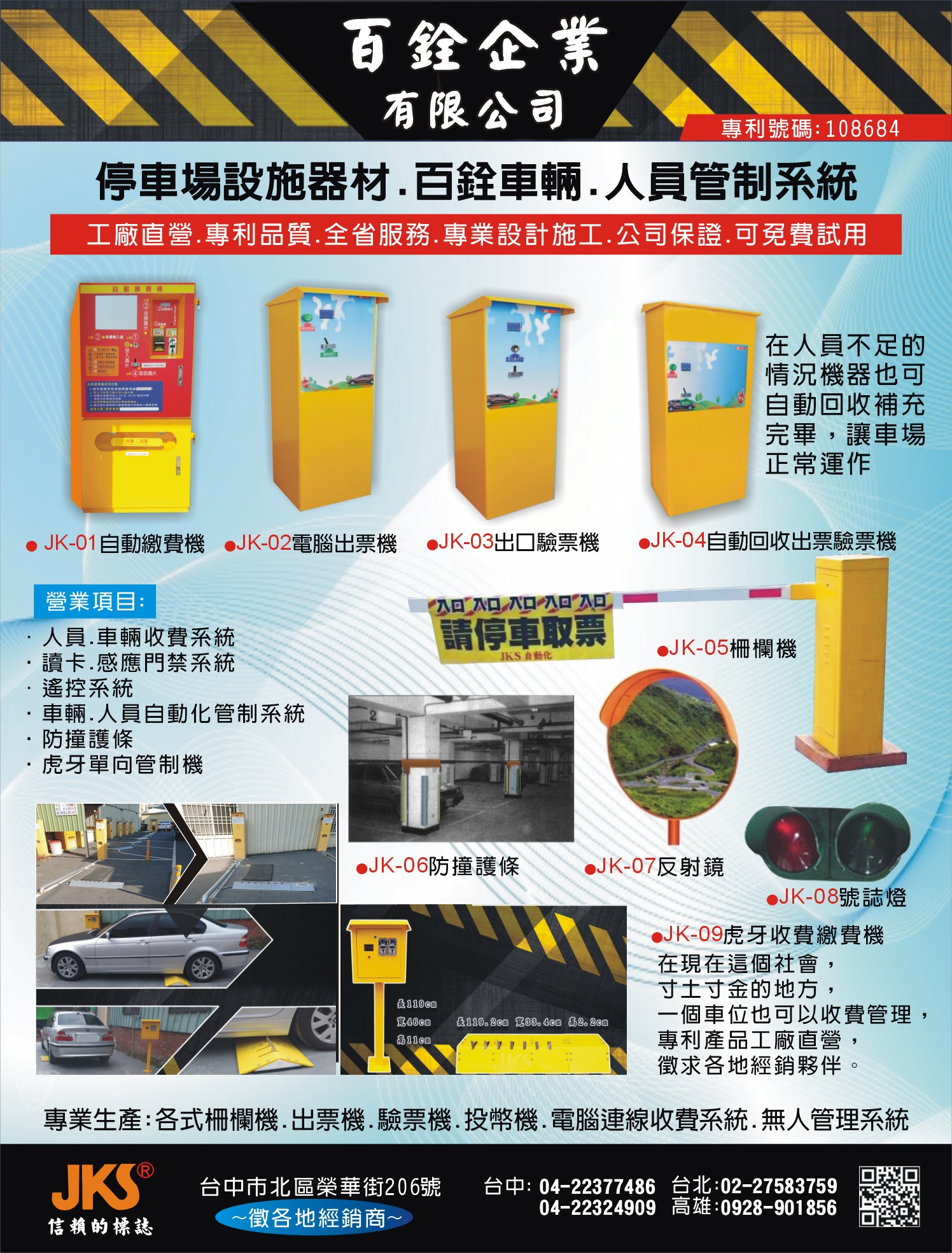 百銓企業有限公司專業生產製造:各式柵欄機、出票機、驗票機、投幣機、電腦連線收費系統、無人管理系統、虎牙收費繳費機,專利字號:108684