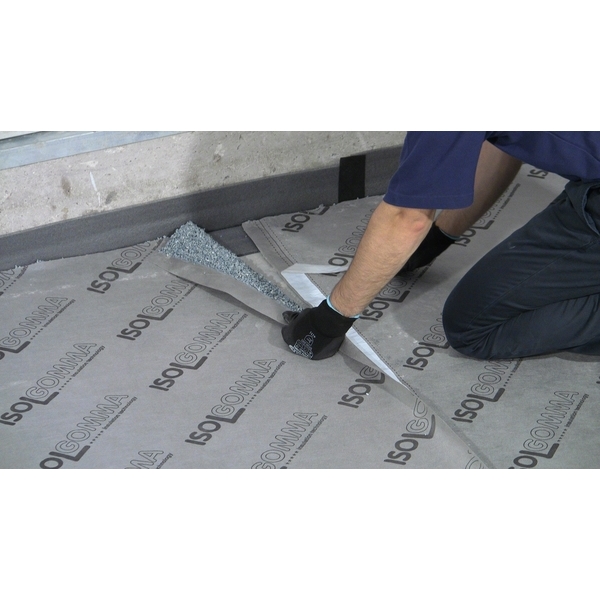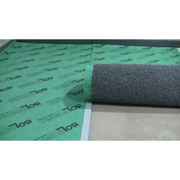 符合建築技術規則46-6條要求, 義大利原裝進口橡膠材質樓板隔音墊, 乃針對國內地坪慣用地磚石材鋪貼工法(厚床砂漿)所選用, 10mm厚度隔音捲材,EPDM橡膠顆粒以羧酸酯膠膠於80g/m2的綠色、抗拉防水不織布結合200g/m2聚酯纖維背襯墊上製成, 每卷隔音墊為500cm長x 104cm寬其中包括4cm寬的自黏長向對接寬度單位重量為2.65kg/m2, 動態剛性(s’)小於18MN/m3