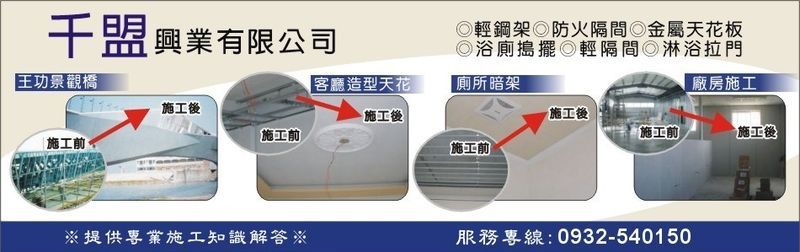 營業項目:彰化輕鋼架、中部輕鋼架、台中輕鋼架、雲林輕鋼架、員林輕鋼架、南投輕鋼架、輕鋼架天花板、輕鋼架、輕隔間、彰化輕鋼架天花板、台中輕鋼架天花板、彰化各式輕鋼架、台中各式輕鋼架、彰化輕隔間、台中輕隔間、浴廁搗擺、隔間天花板、石膏天花板、礦纖天花板、矽酸鈣天花板、浴廁隔間、各式搗擺、淋浴拉門、防火隔間、天花板裝潢、彰化裝潢、中部裝潢、室內隔間、室內裝潢、各式輕隔間、企口鋁板、卡麗、卡U板、金屬天花板、石膏板天花、矽酸鈣板天花、石膏板隔間、矽酸鈣隔間、浴廁峰巢隔間、輕隔間天花板、防火輕隔間、金屬企口天花、防火隔熱、天花板、防火天花板、裝潢、矽酸鈣板、石膏板、蜂巢板、企口天花板、乾溼分離、防火建材、暗架天花板、礦纖板、耐磨地板、木地板、塑膠地磚、鋁板、岩綿板、水泥板隔間、明架天花板、塑膠壁板、高架地板、隔音牆、塑合板、室內裝修、工程承包、整體規劃、責任施工、自工價廉、千盟、客廳造型天花