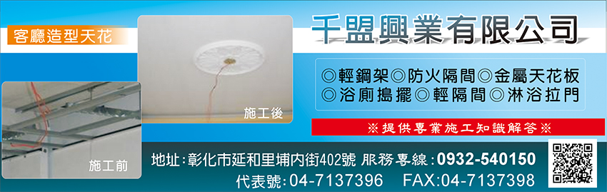 彰化輕鋼架、中部輕鋼架、台中輕鋼架、雲林輕鋼架、員林輕鋼架、南投輕鋼架、輕鋼架天花板、輕鋼架、輕隔間、彰化輕鋼架天花板、台中輕鋼架天花板、彰化各式輕鋼架、台中各式輕鋼架、彰化輕隔間、台中輕隔間、浴廁搗擺、隔間天花板、石膏天花板、礦纖天花板、矽酸鈣天花板、浴廁隔間、各式搗擺、淋浴拉門、防火隔間、天花板裝潢、彰化裝潢、中部裝潢、室內隔間、室內裝潢、各式輕隔間、企口鋁板、卡麗、卡U板、金屬天花板、石膏板天花、矽酸鈣板天花、石膏板隔間、矽酸鈣隔間、浴廁峰巢隔間、輕隔間天花板、防火輕隔間、金屬企口天花、防火隔熱、天花板、防火天花板、裝潢、矽酸鈣板、石膏板、蜂巢板、企口天花板、乾溼分離、防火建材、暗架天花板、礦纖板、耐磨地板、木地板、塑膠地磚、鋁板、岩綿板、水泥板隔間、明架天花板、塑膠壁板、高架地板、隔音牆、塑合板、室內裝修、工程承包、整體規劃、責任施工、自工價廉、千盟、客廳造型天花