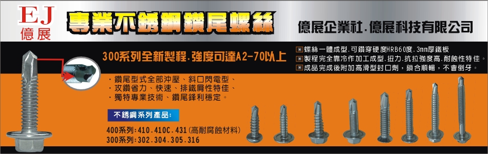 經營項目:不銹鋼鑽尾螺絲、鑽尾螺絲、不銹鋼螺絲、螺絲300系列、螺絲302、螺絲304、螺絲305、螺絲316、螺絲400系列、螺絲410、一體成型螺絲、鑽尾型式全部沖壓、斜口閃電型螺絲、攻鑽省力螺絲、攻鑽快速螺絲、排鐵屑性佳螺絲、耐蝕性佳螺絲、抗拉力強度高螺絲
