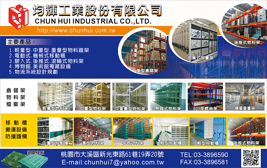 倉儲架、物料架、檔案架、移動櫃、搬運設備、防撞護欄、輕量型物料架、中量型物料架、中重量型物料架、懸臂式料架、DIY免螺絲架、角鋼、積層式物料架(重型架)、中量型移動櫃、重型物料架、輕量型移動櫃、貨架、後推式物料架、塑膠棧板、免螺絲架、料架、重型架、倉儲設備、輕量架、積層架、電動移動櫃、流利架、後推式貨架、駛入式貨架、橫拉式移動櫃、圖書館設備、棧板架、博物館蒐藏設備、人車分道安全護欄、重型交通護欄、工業安全門、貨架保護套、貨架側邊防護欄、小型護欄、大型基柱防護、月台碼頭防撞塊、超級防撞柱、掛畫式移動櫃、箱體式移動櫃、鐵櫃式移動櫃、抽屜式移動櫃、小品項運輸設備、滾輪式物料鐵架、機械式移動櫃、電動式移動櫃、駛入式物料架、物流系統設計規劃