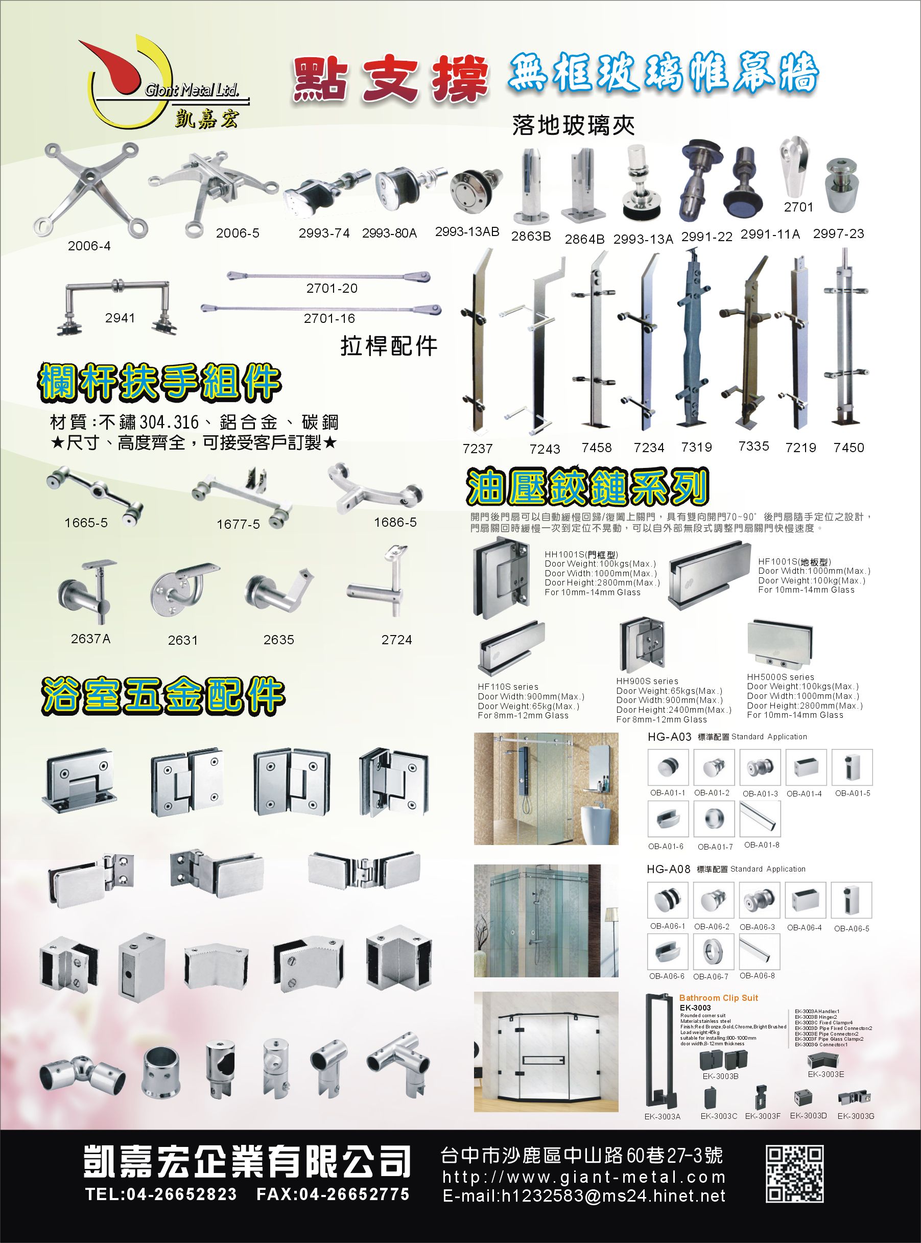 凱嘉宏企業有限公司專業製造與銷售點支式無框玻璃帷幕牆五金配件、玻璃五金、無框淋浴玻璃浴室五金.玻璃門五金.欄杆扶手.活動隔音牆.活動牆五金.鉸鍊.連接器.轉接器.電動爬梯機.電動門.電動曬衣架.螺旋梯.扇形梯.迴旋梯.如意梯.組合梯.樓梯配件.等等...,歡迎工程業界不吝指教!