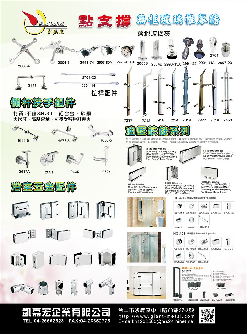 凱嘉宏企業有限公司專業製造與銷售點支式無框玻璃帷幕牆五金配件、玻璃五金、無框淋浴玻璃浴室五金.玻璃門五金.欄杆扶手.活動隔音牆.活動牆五金.鉸鍊.連接器.轉接器.電動爬梯機.電動門.電動曬衣架.螺旋梯.扇形梯.迴旋梯.如意梯.組合梯.樓梯配件...等等。