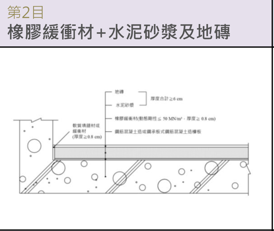 其上鋪設橡膠緩衝材(厚度≧0.8 cm ,動態剛性≦50 MN/m³),其上再鋪設水泥砂漿及地磚厚度合計≧6 cm 。