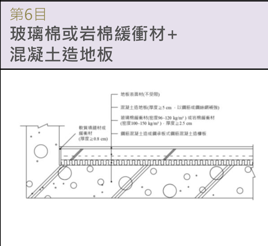 其上鋪設玻璃棉緩衝材(密度96~120 kg/m³)或岩棉緩衝材(密度100~150 kg/m³)厚度≧2.5 cm,其上再鋪設混凝土造地板(厚度≧5 cm,以鋼筋或鋼絲網補強),地板表面材得不受限。