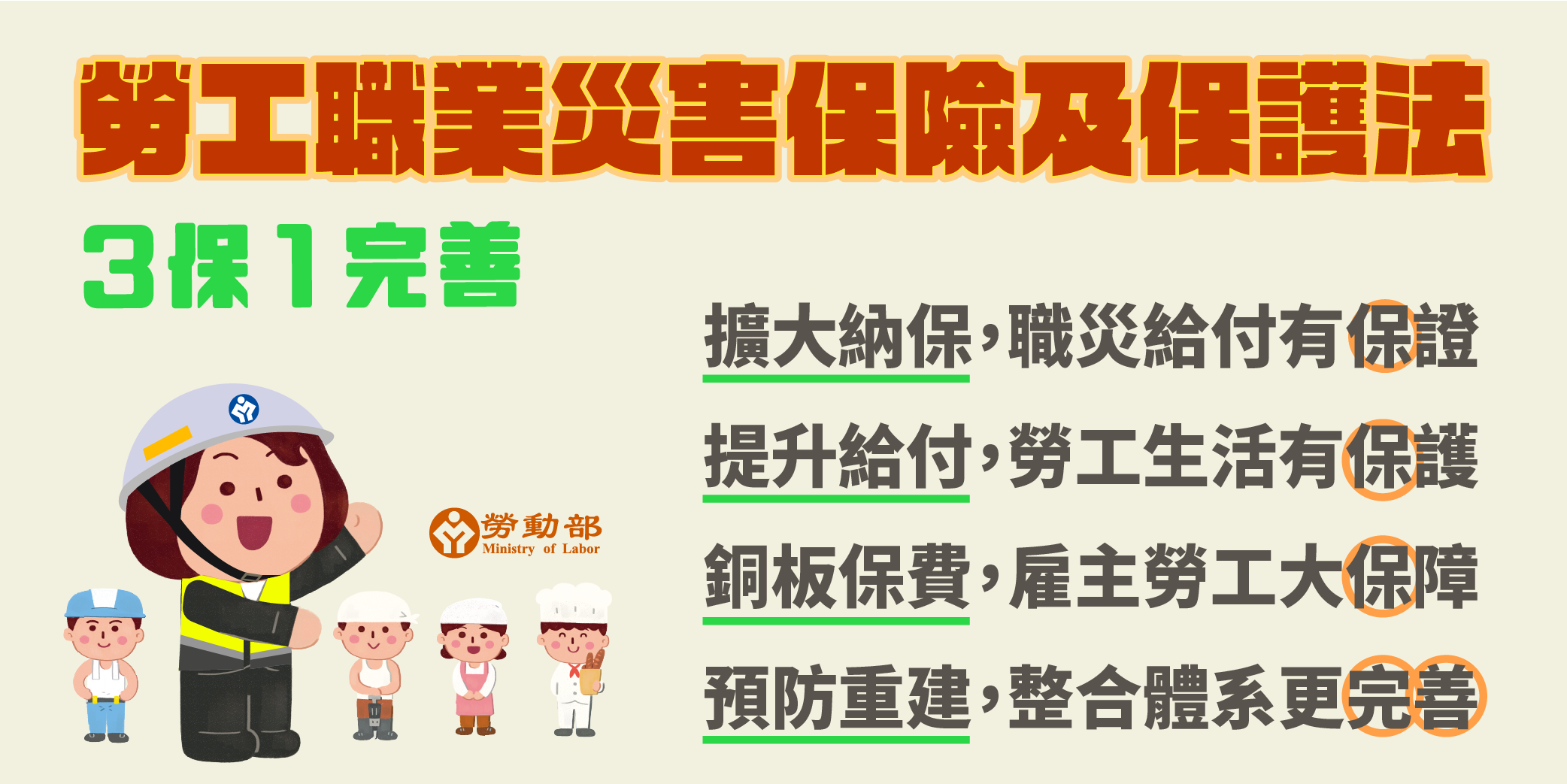 「勞工職業災害保險及保護法」以專法的形式,將勞工保險條例的職業災害保險,及職業災害勞工保護法的規定予以整合,除擴大納保,受僱勞工到職即有保障,一旦發生職災,政府有給付保證;提升各項給付,勞工災後生活有保護;雇主也藉由少許保費,讓勞工獲得大保障,雇主更有效分攤補償責任;並整合職災預防與重建業務,使整體職災保障制度更完善。該法於110年4月30日制定公布,並經核定自111年5月1日施行,勞動部也將盡速研訂相關子法及措施,讓法案順利上路施行。