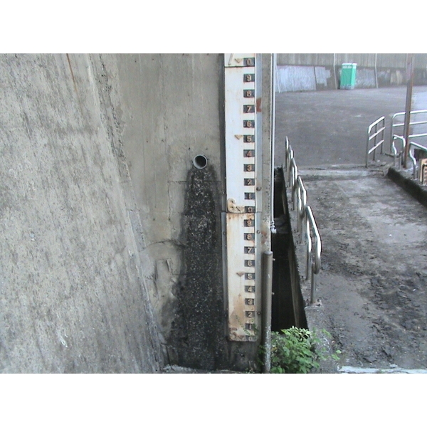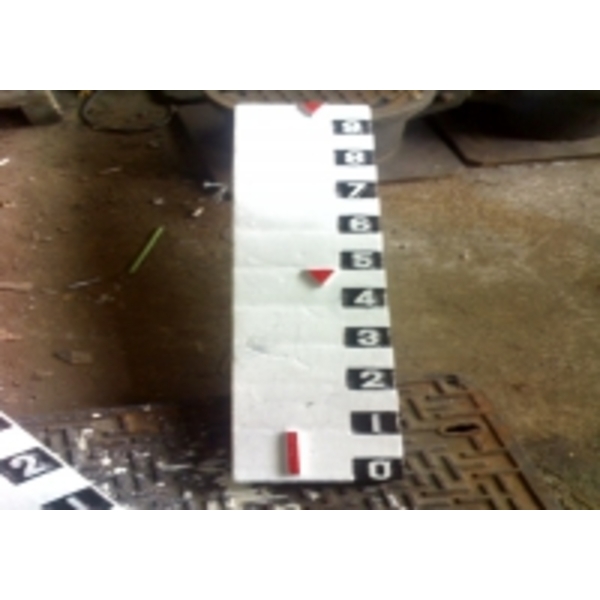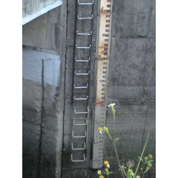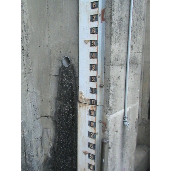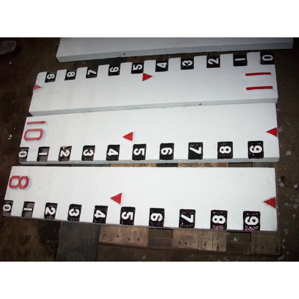 一般(並非制式)的水尺.水位尺(遠距觀測)顏色採用附圖的方式,每米一支,公尺數字用紅色,公分則用黑底白色。