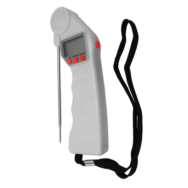 DTG-FD 數位溫度計的測棒材質為不鏽鋼,可插入熟食以測量溫度。