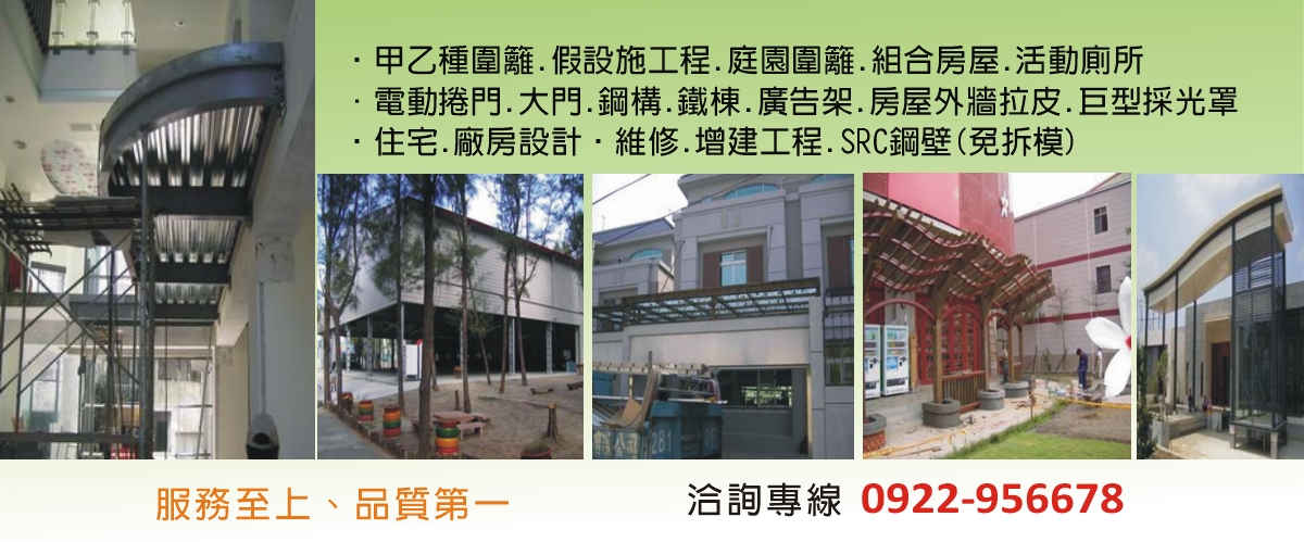 甲乙種圍籬、庭園圍籬、SRC鋼壁、組合屋、假設施工程、鋼構、甲種圍籬、乙種圍籬、圍籬活動廁所、免拆模、鐵棟、電焊網、鋼構看板架、樓層板、組合房屋、工地圍籬、鋼骨結構、電動天車、不銹鋼防盜窗、不鏽鋼防盜窗、電動門、電動捲門、鋼構工程、鐵棟工程、鐵厝、大門、房屋外牆拉皮、巨型採光罩、廣告架、住宅設計、廠房設計、維修工程、增建工程、房屋修改、鍛造門窗、烤漆浪板、玻璃屋、鐵捲門、採光罩、房屋增建、花架、不銹鋼門窗、雨棚、造型鋼構、工程設計、規劃、富將、台中庭園圍籬、台中鋼構、台中樓層板、台中流動廁所、台中房屋增建、台中花架、台中甲乙種圍籬