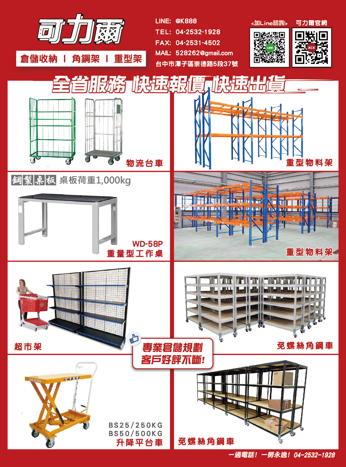 倉儲設備、免螺絲角鋼架、DIY置物推車、置物推車、貨架、重型物料架、洞洞板置物架、工作桌、搬運設備、鋼板物料架、組合架、物流台車、倉庫籠、零件櫃、沖孔架、工具車、工作車、平台車、置物櫃、天鋼系列、其他組合推車、不銹鋼產品、雨量筒、中重量型料架、五金設計、物料架、萬能角鋼五金生產、壓克力、紅布條、儲物架、廣告業務、萬能角鋼、可力爾有限公司、台中倉儲設備、台中物料架、台中置物架、台中置物櫃、台中儲物架