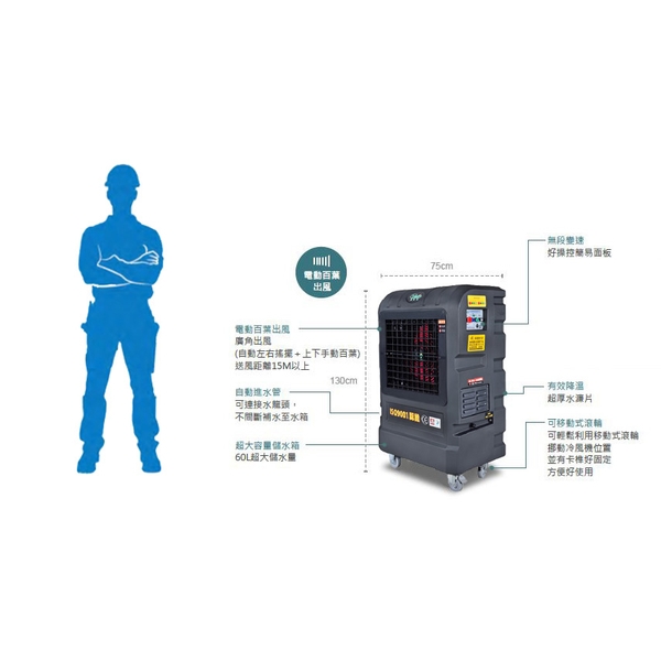 變頻水冷扇營業用大機種,適用於各種室內、外悶熱場所。工廠、汽車修配廠、溫室、畜牧業、餐廳、店面、活動場所等皆適用。