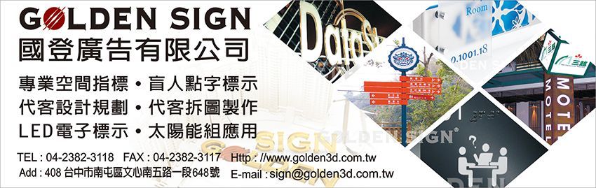 標示牌、指示牌、招牌、壓克力、盲人點字、空間指標、空間標示、台中招牌、台中標示牌、台中指示牌、台中壓克力、台中盲人點字、台中門牌、指標、門牌、標誌牌、全銜、室內標示、壓克力標誌牌、中部招牌、平面圖、樓層總覽、樓層標示、廁所標示牌、盲點、盲胞點字、水晶字、壓克力製品、壓克力字、壓克力盒、立體字、殼字、不鏽鋼字、銅字、千那論立體字、彩圖輸出、大圖輸出、LED招牌、造型招牌、裝置藝術招牌、LED字幕機、LED燈、公司招牌、壓克力招牌、壓克力製品設計、壓克力製品製作、室內空間標示、室外空間標示、平面配置圖、逃生圖、LED標示牌、LED發光殼字、公司全銜、客製化招牌、客製化指示牌、客製化標示牌、造型廣告物、裝置藝術、室外指標工程、室內指標工程、國登、國登廣告、Golden Sign