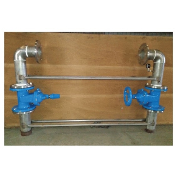 中間藍色部分,左側為指針式,右側為帶有輪盤的閥門式,以及連接水表的金屬管道和彎頭。