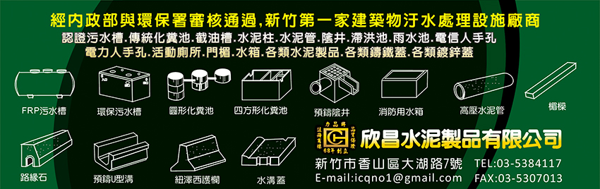 認證污水處理槽、水泥管、截油槽、滯洪池、雨水池、各類鑄鐵蓋、各類鍍鋅蓋、RC污水槽、FRP污水槽、RC儲水槽、傳統化糞池、水泥柱、水泥製品、陰井、電信手孔、電信人孔、電力人孔、水箱、欣昌、力品牌預鑄式RC認證污水處理槽、井圈、門樑、活動廁所、FRP化糞池、PE傳統化糞池、PE水塔池、高壓管、高壓人孔、低壓人孔、新竹號誌人孔、新竹電力手孔、新竹楣樑、新竹蓄水槽、新竹沉砂池、新竹採樣池、新竹井圈、新竹污水槽、新竹污水處理槽、新竹環保化糞池、新竹中水雨水回收槽、新竹雨水滯洪池、新竹油脂截留器、新竹油脂截油槽、新竹油水分離槽、新竹水泥洗衣槽