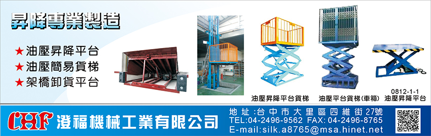 油壓昇降平台、油壓昇降貨梯、殘障專用步道、汽車昇降機、自走式高空作業台、油壓平台貨梯、油壓平台車廂、裝卸貨月台規劃、自走式電動堆高機、油壓動力單元、機械式停車設備、簡易型貨梯、標準型剪臂平台、火車站殘障專用步道、月台轉接平台、旋轉台、子母橫移,平台天車交會_活動軌道、剪臂式機車作業平台、簡易懸臂式貨梯、貨車用高空作業台、油壓升降平台貨梯5、DC24V自走式高空作業台,專用堆高機、專用作業平台_同步升降雙堆高機平台、chf-x、油壓昇降平台_附斜坡板、DC12V自走式病床用昇降機、搬運機械、生產製造買賣、台中油壓升降平台、台中油壓升降貨梯、台中自走式高空作業台、台中裝卸貨平台、台中汽車昇降梯