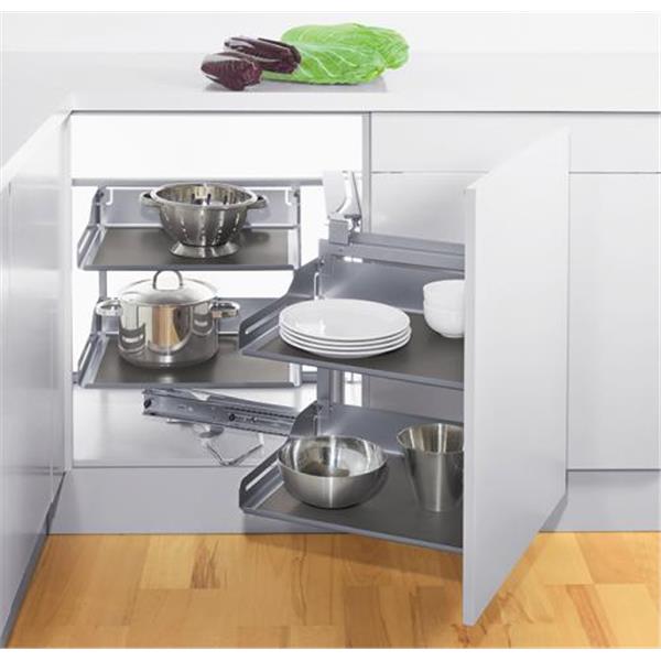 打開櫃門即可順勢將四個盤籃從角落空間拉出,取出及放置物品均相當便利