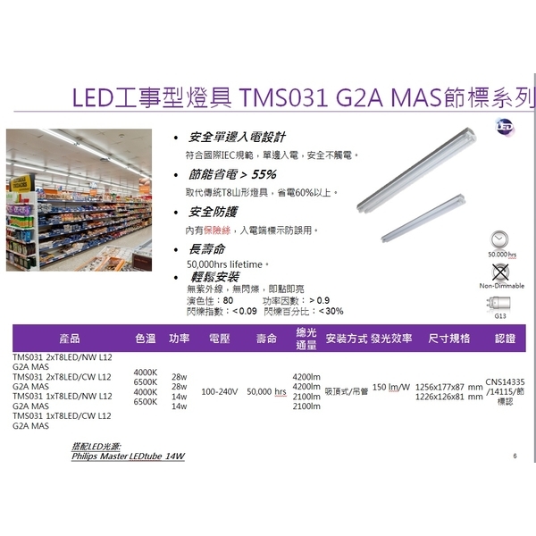 飛利浦工事形燈具G2A MAS節標系列/4呎雙管28W(4200LM)/發光效率150LM/W/安全單邊入電