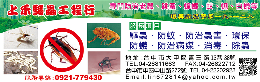 台中專業消毒、台中除蟲、除白蟻、抓老鼠、蟑螂、除跳蚤、白蟻驅除、病媒防治、環境消毒、防蚊、防治蟲害、環保防蟻、防治病媒、消毒、除蟲大台中消毒、除蟲、台中白蟻專家、消毒公司、消滅蚊蟲、馬陸、驅除蜈蚣、螞蟻、蛀蟲、蜘蛛、中部消毒、驅蟲、環保、害蟲、消毒驅蟲、海線消毒、白蟻公司、專業除蟲、防治白蟻、白蟻防治、白蟻消毒、專業驅除白蟻、專業消毒、專治白蟻、除蟲公司、海線除蟲、白蟻專家、專業除蟲公司、專業白蟻、大海線消毒、大海線除蟲、蟲害消毒、上禾、台中消毒公司、台中白蟻防治、台中蟲害消毒