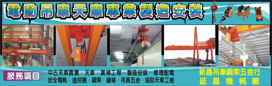 營業項目:各國電動吊車、天車、中古天車買賣、貨梯工程、天車製造安裝、天車維修、天車修理配電、天車安全電軌、天車遙控器、天車鋼索、天車鏈條、吊具五金、協助天車工檢、天車零件、超短型天車、電動吊車、吊車、電軌